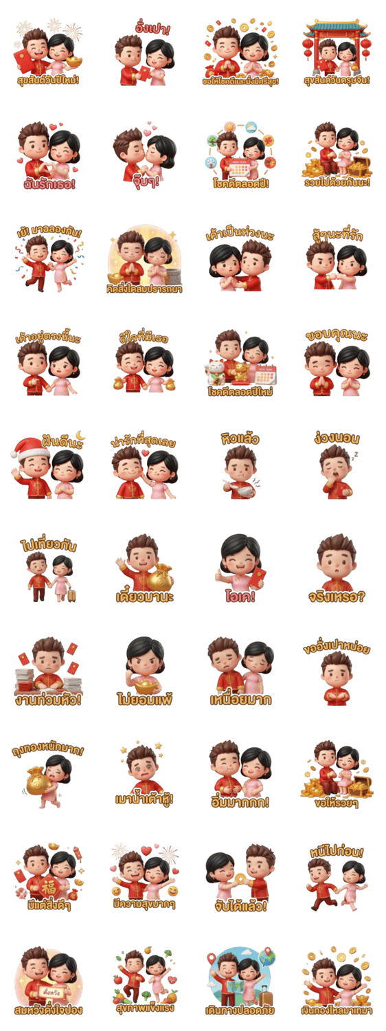 | スタンプ説明 | Celebrate Chinese New Year with this adorable 3D cartoon couple! Sharing love, good fortune, and festive cheer with angpaos and golden pouches. |