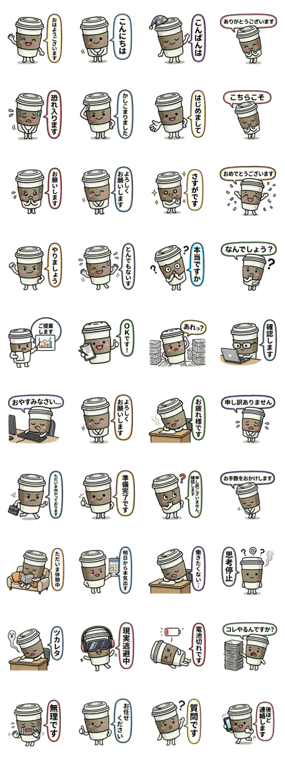 仕事するって大変!会社でも日常でも使えるゆるかわコーヒーカップの日常スタンプ♪(挨拶・充電切れ)