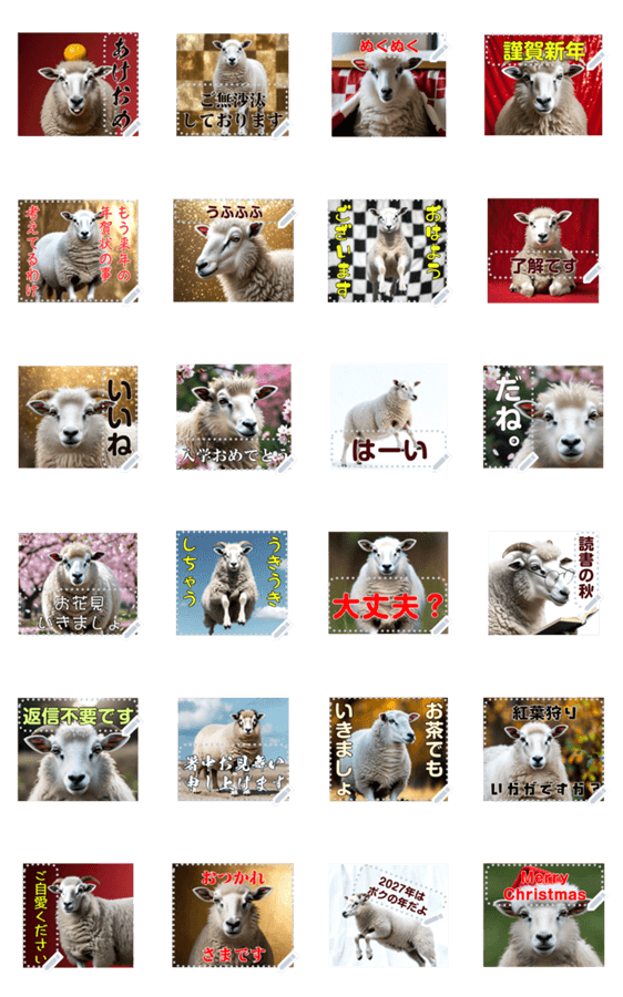 文章を自由に書き込める♡ リアルなひつじで春夏秋冬イベントフレーム♪ ヒツジ/シープ/干支/2027年/お正月/年賀スタンプ/クリスマス/暑中お見舞い/こたつ/紅葉/春の桜 現在この商品は一部のスマートフォン版LINE 10.3.0以上のトークルームでのみ使用できます。動作環境の最新情報はヘルプをご確認ください。