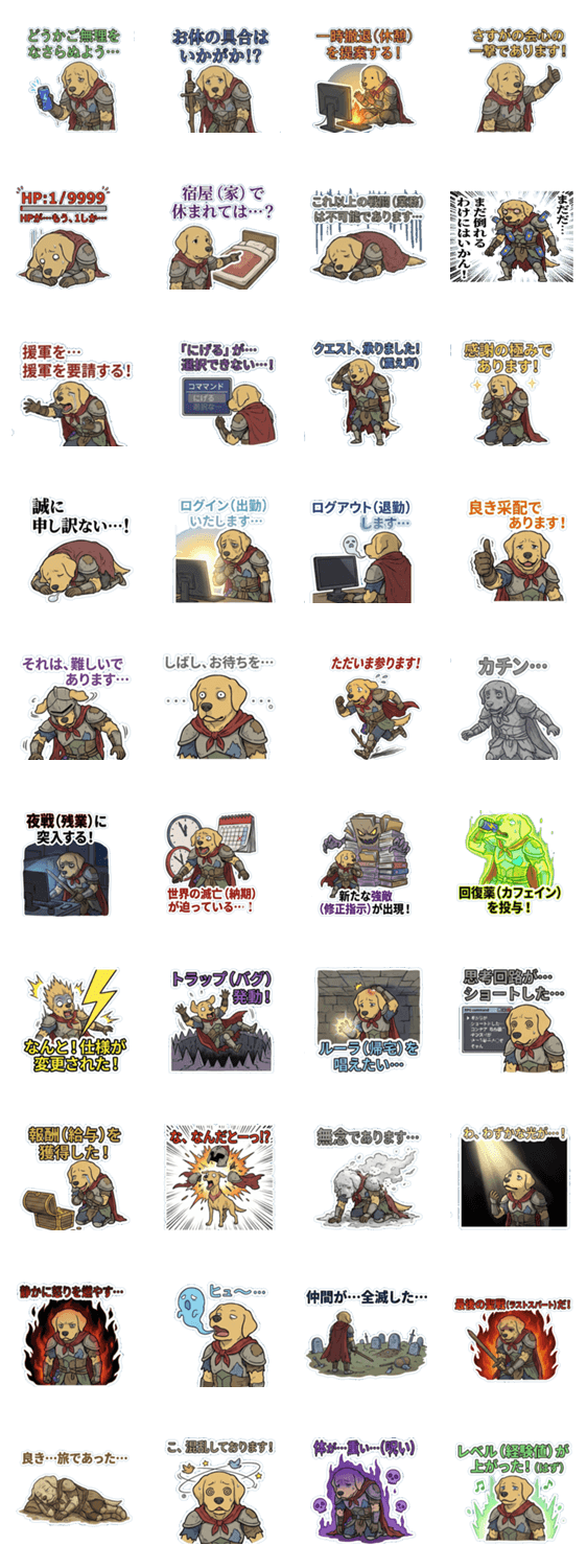 終わらない残業というダンジョンに挑む、HP残り1のゴールデンレトリバー。上司(魔王)への報告、修正指示(トラップ)回避など、仕事で使えるRPG風スタンプ。