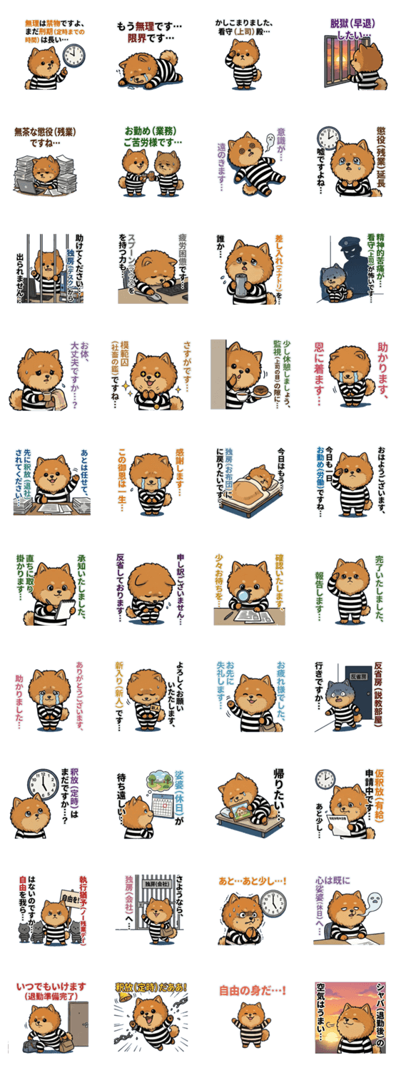 会社=監獄。定時退社を夢見る囚人ポメラニアン。残業、仕事、上司への返信に使える社畜の敬語スタンプ。毎日「帰りたい」あなたへ。