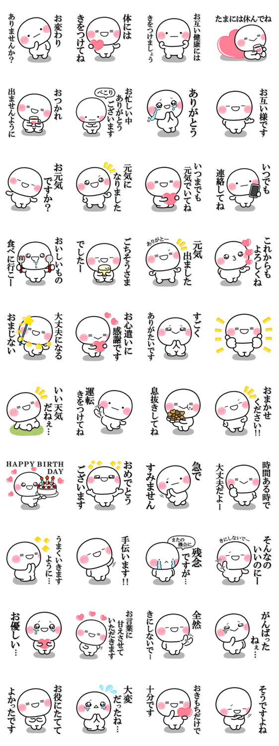 | スタンプ説明 | しろまるが優しさのあまり頬をピンク色に染めてしまった相手を思いやるスタンプです。ずっと使える内容を揃えましたので、どなたにもオススメ。大人ver【作:いしいともこ】 |