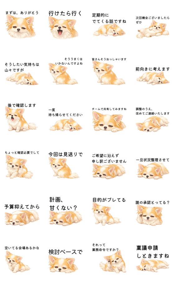 | スタンプ説明 | 社会人がつい使ってしまう“あの言い方”で、散歩を拒否するチワワです。ネタに見えて、実は日常でも意外と使えるスタンプです。 |