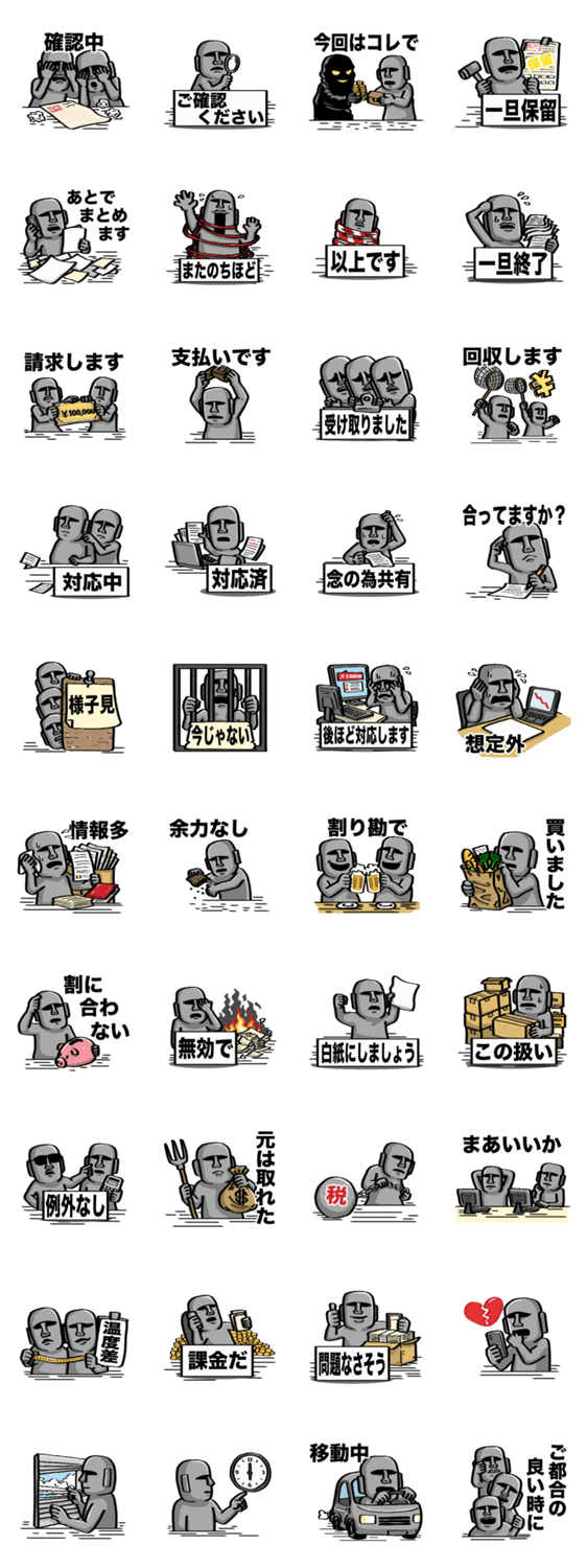 お金・判断・やりとりの気まづい場面で使えるモアイです。仕事や日常で何度も使う言葉を中心に揃えました。相手を選ばず、仕事・友達・グループでも使いやすいスタンプです
