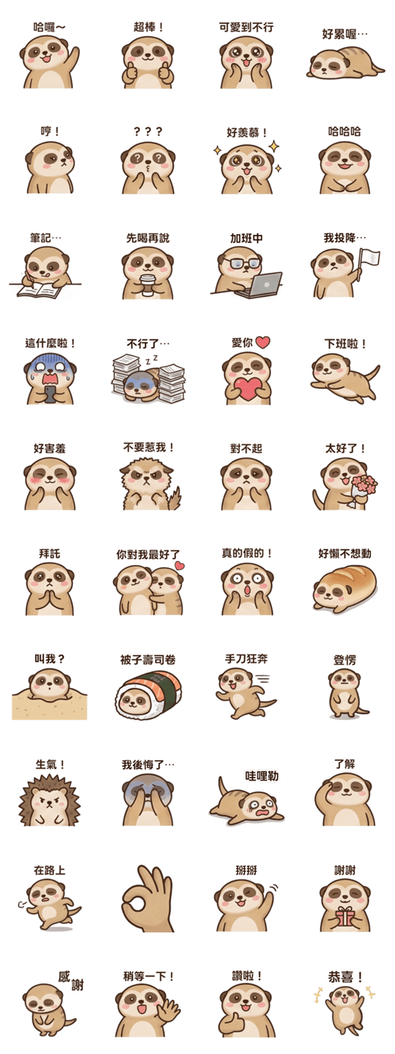 A friendly meerkat sticker set designed to accompany your daily conversations.