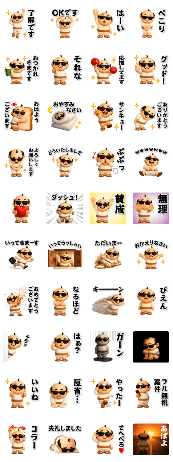 | スタンプ説明 | グラサンファミリー/サングラスパパ/父親/お父さん/パピー/ハゲ/昭和レトロ/オヤジギャク/ナウい/ノスタルジー/毎日使える/日常会話/挨拶/あいさつ/年中使える/デカ文字 |