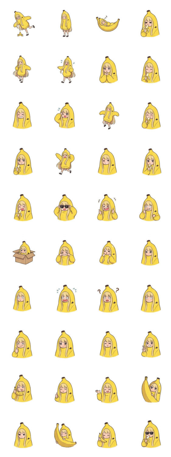 | スタンプ説明 | 風変わり,面白い,バナナの皮,ふざける,そらす,注目,果物,黄色,冗談,可愛い,チャット,ユーモア,コスチューム,おもしろ |