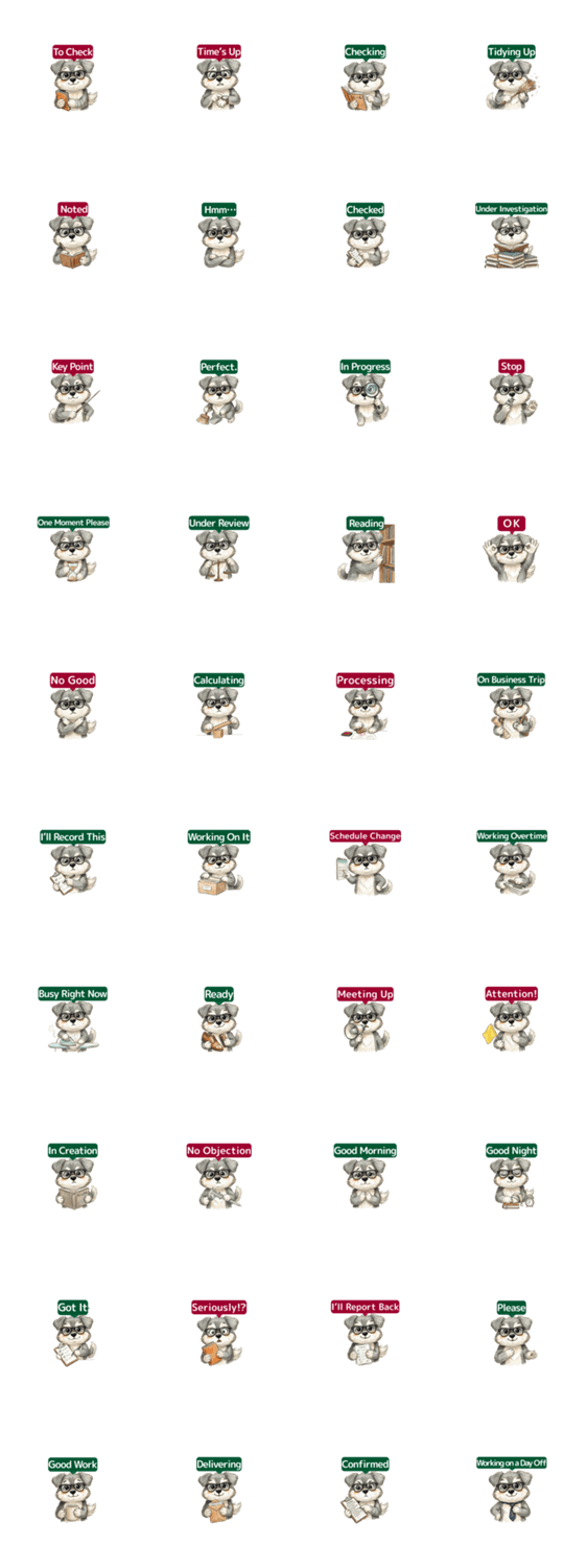 | スタンプ説明 | お仕事のやりとりに使いやすい、犬のスタンプの英語版です。 確認・報告・チェックなど、ビジネスシーンで活躍します。 シンプルで親しみやすく、日常の連絡にも使えます。 |