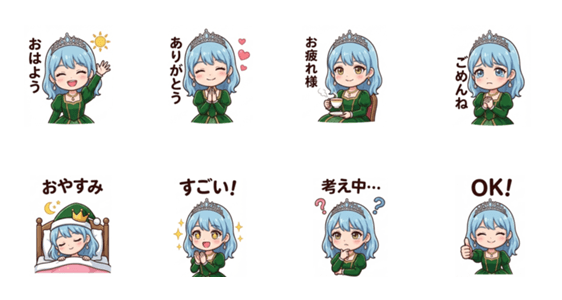 やさしくて上品なプリンセスの日常スタンプです。 あいさつや気づかいの言葉など、毎日の会話に使いやすいです。
