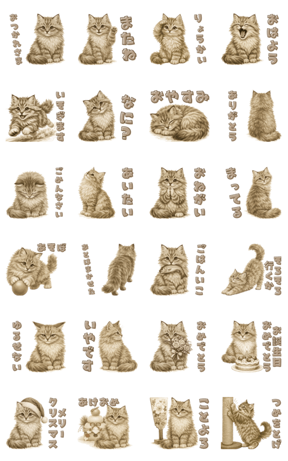 墨絵の線でゆるっと表現。ふわもこサイベリアン子猫の、使いやすい日常スタンプです♪
