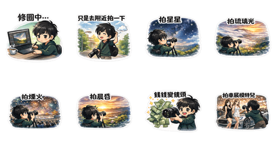 | スタンプ説明 | Daily life of photographers: shooting at night, editing photos, buying lenses, and endless backups. |