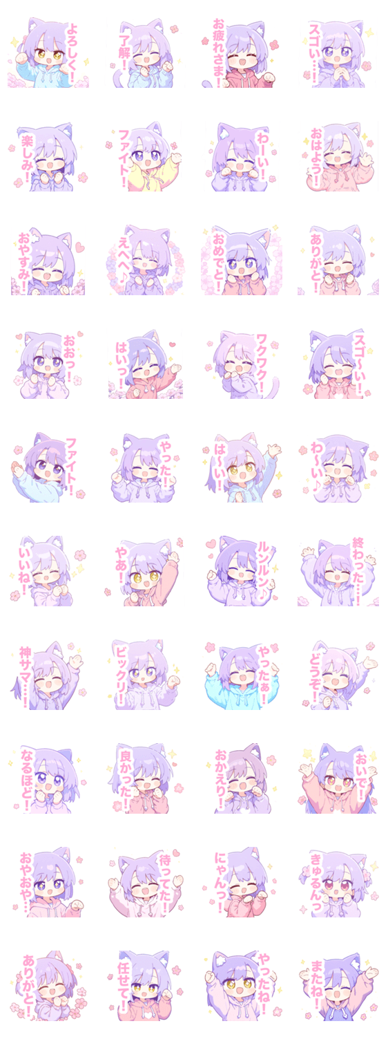 日常的なセリフ付きです。猫耳/パーカー/パープル/毎日/挨拶/会話/女子/女の子/ちびキャラ/ミニキャラ/チビキャラ