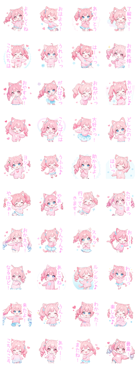 ピンク/ツインテール/猫/猫耳/ゆるかわ/ピンク髪/かわいい/可愛い/挨拶/日常/会話/涼しい/女の子/女子/癒し/ゆるい/ふわふわ/ちびキャラ/ミニキャラ/パステルカラー/ハート