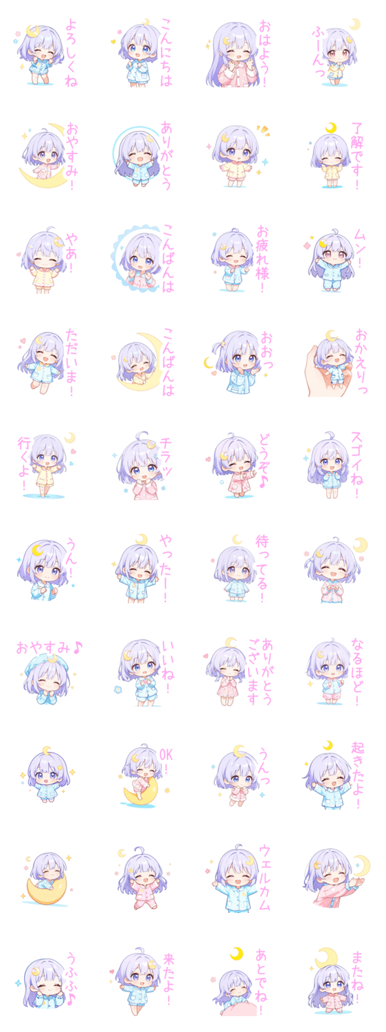 紫髪/パープル/月/星/ゆるかわ/かわいい/可愛い/挨拶/日常/パステルカラー/会話/女の子/女子/癒し/ドリーム/ふわふわ/夜/ちびキャラ/ミニキャラ/デフォルメ/花/ハート
