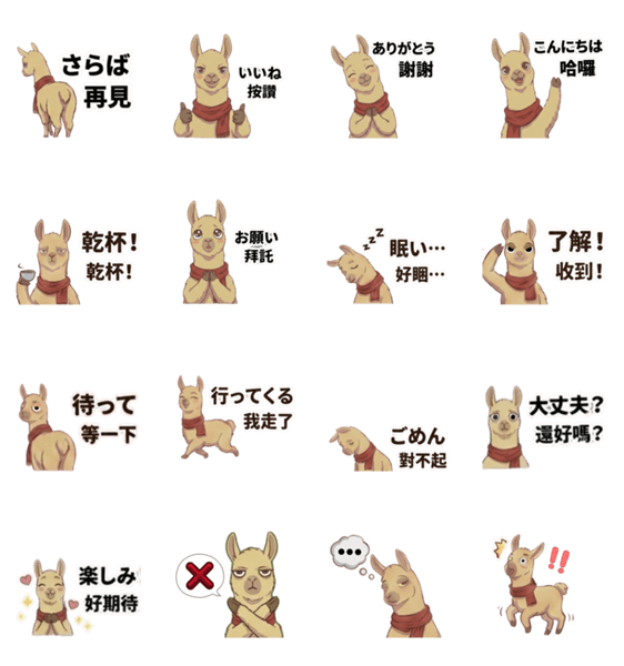 日本と台湾(繁体字)2つの言語の入った、アルパカ日常スタンプ!