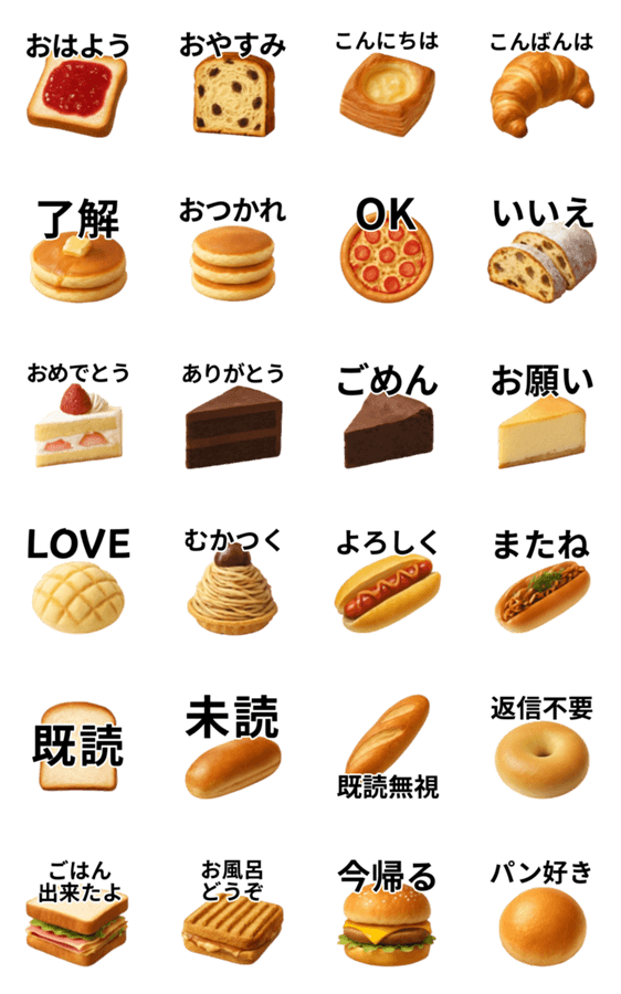 パンとケーキの挨拶スタンプ・食パン・レーズンパン・デニッシュ・クロワッサン・ホットケーキ・ピザ・ショートケーキ・メロンパン・焼きそばパン・ベーグル・ハンバーガー