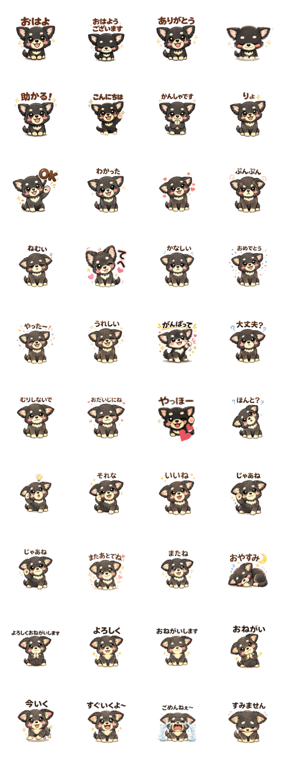かわいい黒チワワのLINEスタンプです。 あいさつ・お礼・お願い・リアクションなど、毎日使いやすい言葉を集めました。 ふわふわチワワが気持ちをかわいく伝えます。
