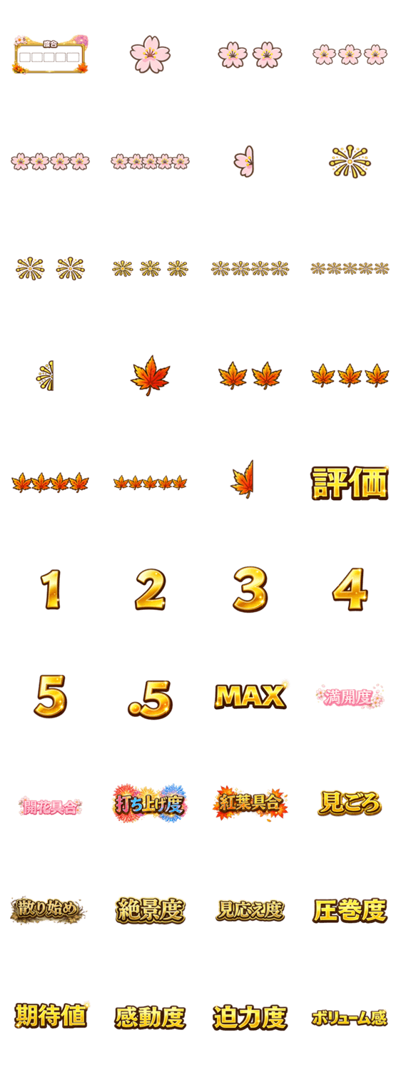評価スタンプ第4弾。絶景度・見応え・迫力など、季節の景色やイベントの感動をアレンジで組み合わせて直感的に伝えられます。他のシリーズとも組み合わせ可能です。