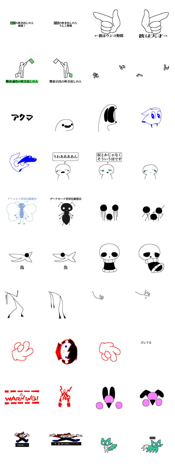 | スタンプ説明 | 自分の視点が全てだと思っていたら痛い目を見るスタンプですわよ 「たい」と「へん」は二人で協力して使ってくださいな スタンプ数が少なかったのでおまけのオリキャラ等 |