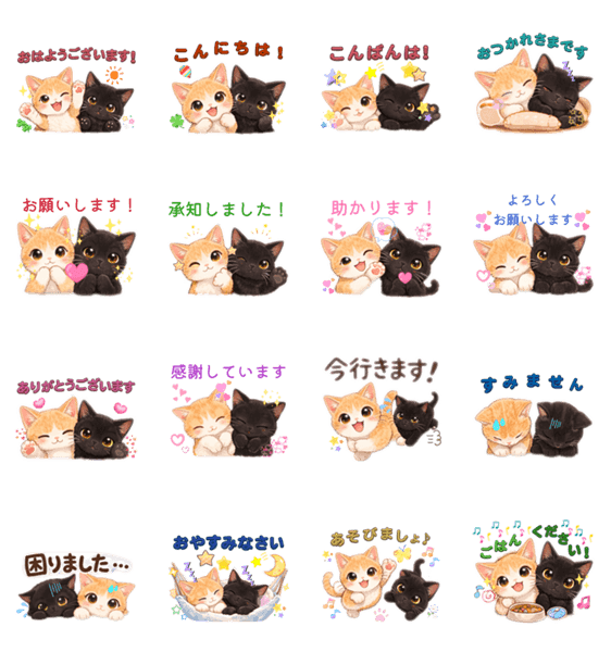 元野良猫のちゃしろとまくろの仲良しコンビスタンプ第一弾です。元気いっぱいのちゃしろと、ちょっとクールなまくろ。毎日の会話で使いやすい敬語スタンプです。