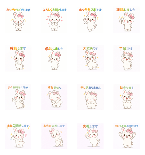 やさしいうさぎ「もっち」のお仕事スタンプ。おつかれさまです、承知しましたなど、仕事で使いやすいスタンプです。