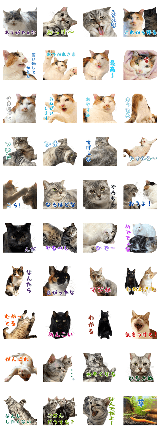 親戚のねこを集めた、あいさつスタンプ集です。 皆がもふもふを愛す!