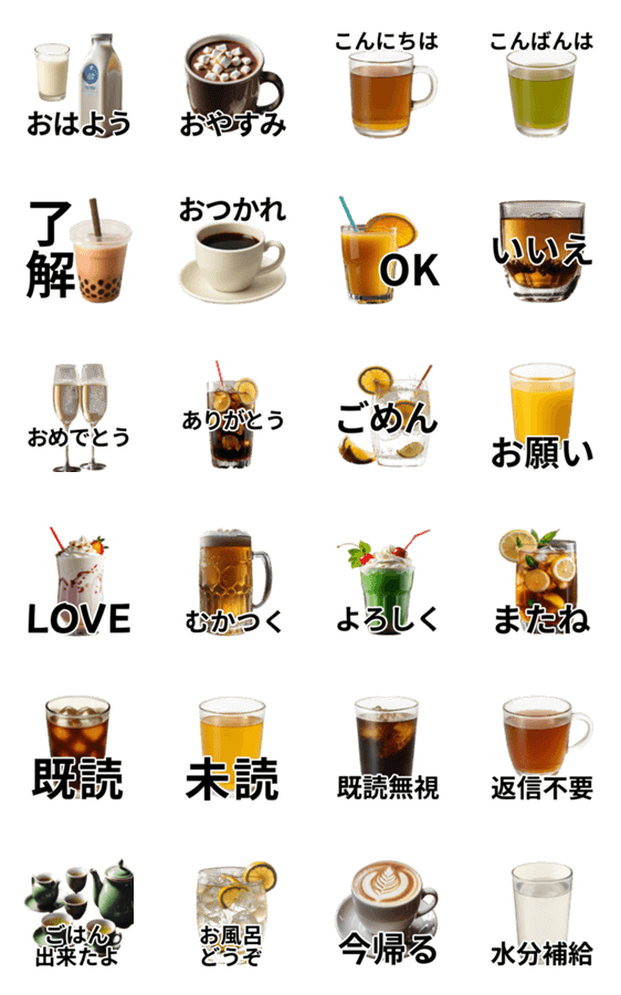 実写みたいな飲み物の挨拶スタンプです。牛乳・マシュマロココア・麦茶・緑茶・タピオカミルクティー・コーヒー・オレンジジュース・シャンパン・コーラ・ビール・レモン