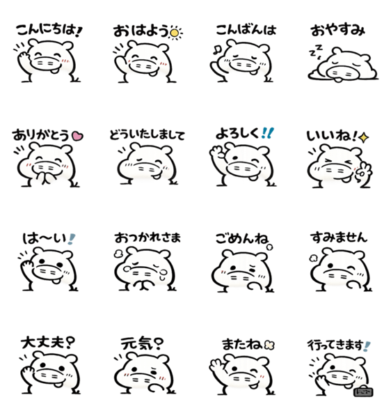 シンプル線画のかわいいカバのあいさつスタンプです。毎日使いやすい定番フレーズをそろえました。