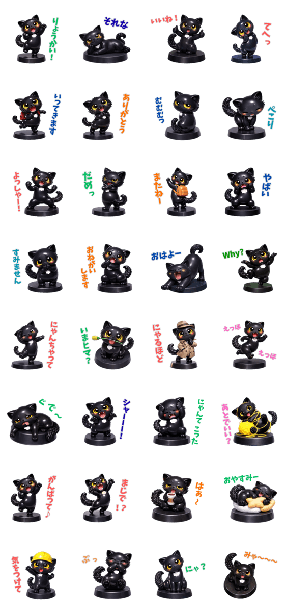 ガチャのトイフィギュアのような黒猫「ぽこたま」のスタンプ。挨拶やリアクションなど毎日のトークで使いやすいものをたくさんセレクト。コレクションにいかがですか♪