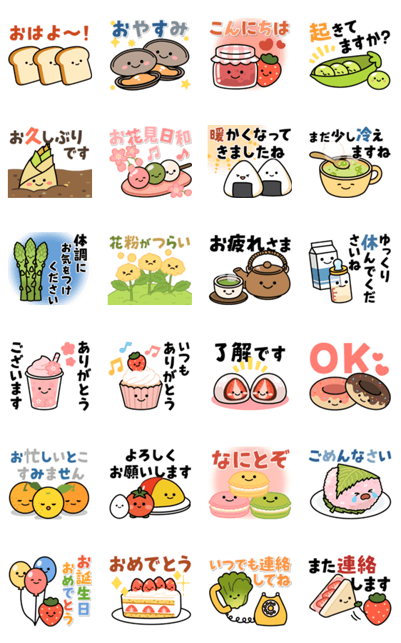 いろいろな食べ物さんたちの毎日使える敬語のスタンプの第二弾です♪春の挨拶や日常の言葉など盛りだくさんで使いやすい♪