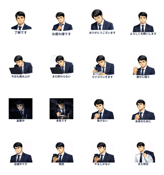 | スタンプ説明 | 派手じゃない。声も大きくない。 でも、諦めていない! 会社に依存しない生き方を目指す 静かに闘う40代男性のためのスタンプ 仕事でも使える。 共感で使うスタンプです。 |