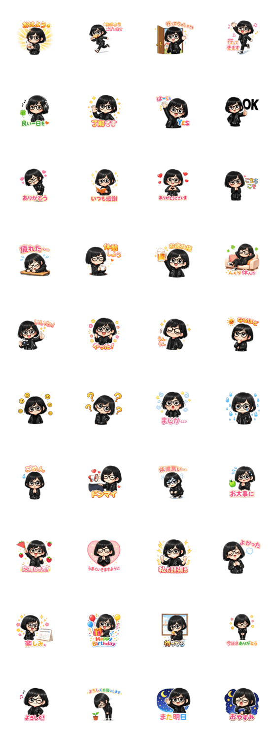 黒縁眼鏡とショートボブが特徴の、クールでかっこいい女の子のスタンプです。3Dイラストのスタイリッシュなデザインで、毎日のトークをスマートに彩ります。