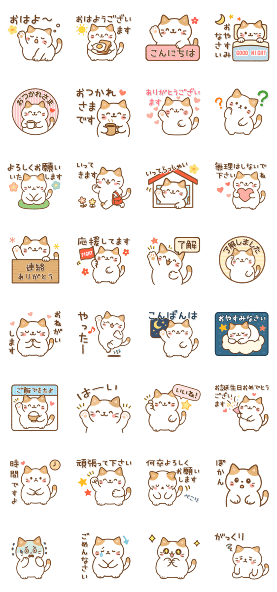 | スタンプ説明 | 猫好きな方必見!毎日使える可愛い猫(ねこ)のスタンプです☆使いやすさにこだわりました♪挨拶や敬語など家族や友達とのトークにぴったり♪癒し系、ほのぼの、使いやすい |