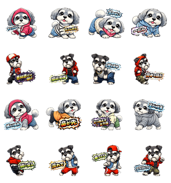 ゆるかわ&キレ強めのストリートダンスを踊るシュナウザーのスタンプ。犬らしい四足ポーズで、日常のリアクションや連絡にも使いやすい、愛嬌たっぷりのシリーズです。