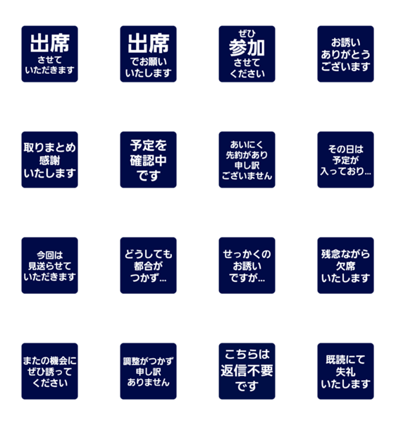 出欠連絡や予定調整に。欠席や保留の時も失礼なく丁寧に即レス!【ネイビー】仕事 敬語 出席 欠席 お断り ママ友パパ友 学校 PTA 文字だけ シンプル 返信 デカ文字 タイパ