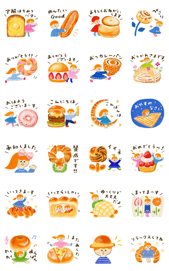 | スタンプ説明 | 美味しいパンが焼けました♫第二弾はさりげなく使いやすい静止画スタンプ♪食パンに明太フランス、あんぱん、メロンパン♪日々のやりとりがふっくら温かくなりますように♡ |