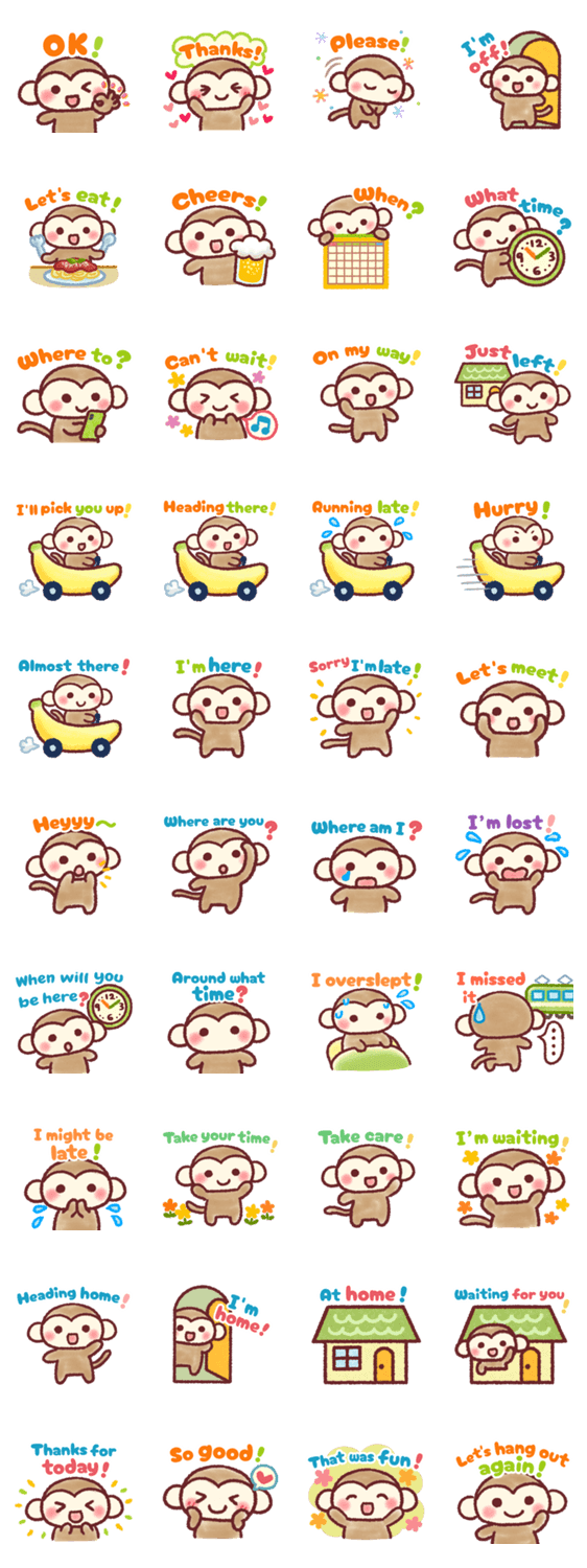 | スタンプ説明 | Cute monkey stickers for chat and meetups! Perfect for meeting up, saying "On my way!", "Where are you?", "Thanks!" and more. Featuring a fun banana car monkey! |