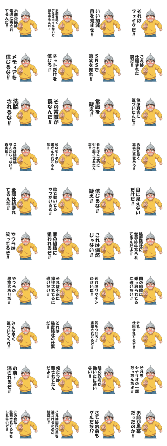 | スタンプ説明 | 陰謀論者、デマ、フェイクニュース、闇の組織、悪の組織、ワクチン、人工地震、洗脳、メディア、デマ、スピリチュアル、ネットde真実、偏向、都市伝説、アルミホイル、電波 |