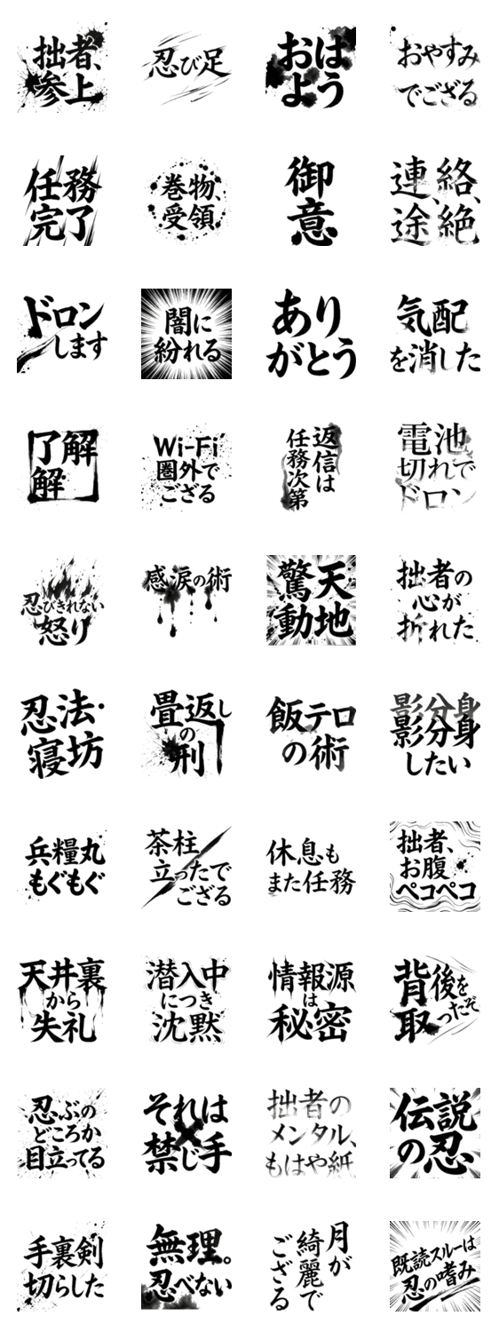 | スタンプ説明 | 忍者のシュールで面白い毎日を力強い筆文字で。日常の挨拶からシュールなネタまで実用的!感情豊かな墨文字がトークを盛り上げる。忍者 筆文字 和風 習字 侍 挨拶 |
