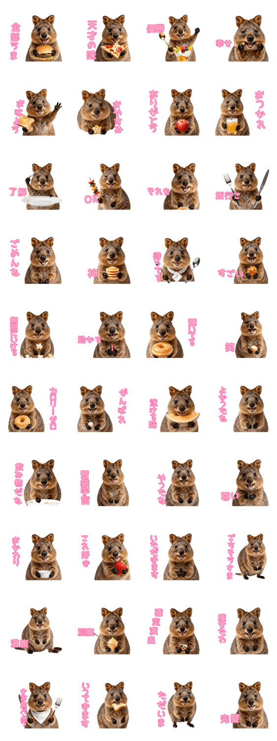 | スタンプ説明 | 世界一幸せな動物「自己肯定感高いクォッカ」の食レポ。全部うま!胃袋宇宙!ポジティブ思考でカロリーも吹き飛ばす、友達や推し活で笑えるネタスタンプ。 |