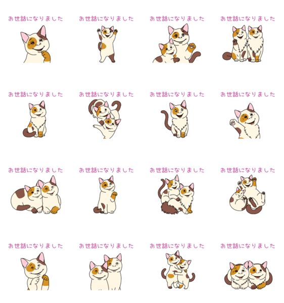 | スタンプ説明 | お世話になりました 三毛猫 茶トラ ネコ 猫 ねこ イラスト ユルい ほっこり おもしろい おしゃれ かわいい 使いやすい 日常 個性的 面白い 使える |