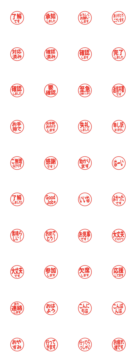 | スタンプ説明 | シンプルな敬語のはんこ風スタンプです。文字が主張しない小さめサイズで、余白を多めにしています。会話の流れを邪魔せず、連絡や仕事の返事に使いやすいデザインです。 |