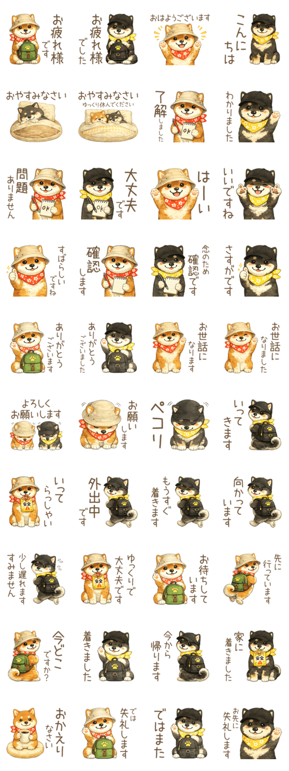 | スタンプ説明 | 一年中使える柴犬のかわいいお出かけの敬語。行楽/外出/春夏秋冬/挨拶/返事/黒柴 |