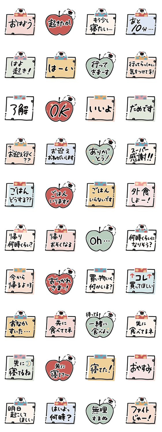 | スタンプ説明 | ひつじとりんごのスタンプ第5弾です。あると助かる、家族間で使いやすい言葉を集めました。羊/林檎/あいさつ/予定/連絡/母/父/かわいい/シンプル/カラフル/付箋/便利/メモ |