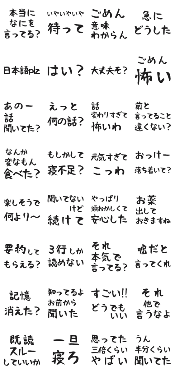 | スタンプ説明 | 謎のテンションだったり頭おかしいことを言い出した友人に送る文字スタンプです。 煽り/ツッコミ/マジレス/ネタ/シュール/友達/身内/ドン引き/辛辣/面白い |