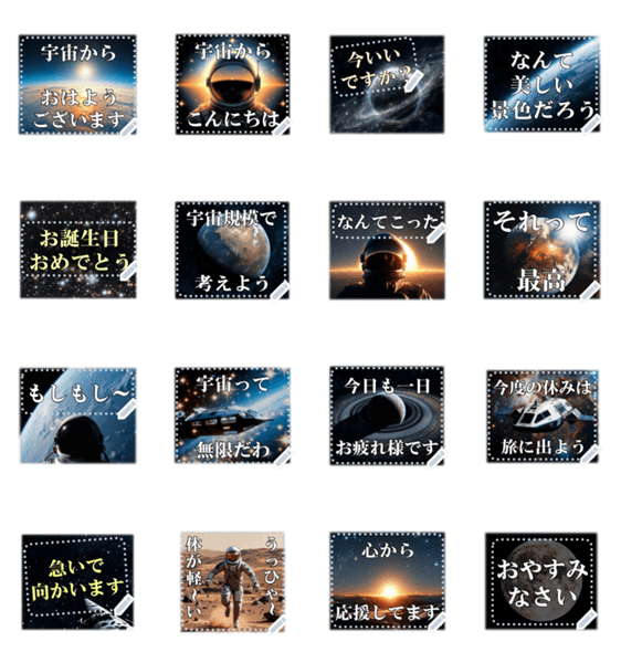 | スタンプ説明 | 自由に文章を書き込めるので挨拶や日常会話・お誕生日祝いなど幅広く使えます♪キラキラ輝く夜空・地球・惑星・火星・宇宙飛行士・宇宙船などのメッセージスタンプ⭐ 現在この商品は一部のスマートフォン版LINE 10.3.0以上のトークルームでのみ使用できます。動作環境の最新情報はヘルプをご確認ください。 |