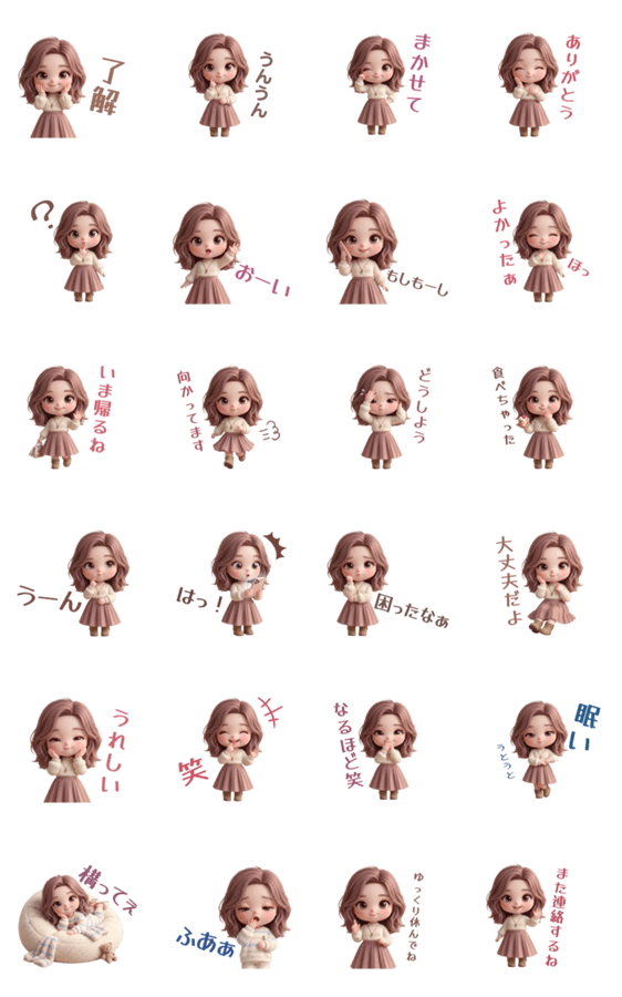 | スタンプ説明 | 3Dのぷにぷに質感がかわいい、淡色系オシャレ女子の日常スタンプです。恋人/カップル/友達/家族/挨拶/リアクション/女の子/AI |