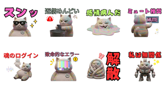 | スタンプ説明 | SNS疲れやめんどくさい誘いに!虹色のデブ猫「ぺたごろ」が、感情死んだ虚無顔で、返信めんどい、スンッ、解散したい本音を代弁します。 |