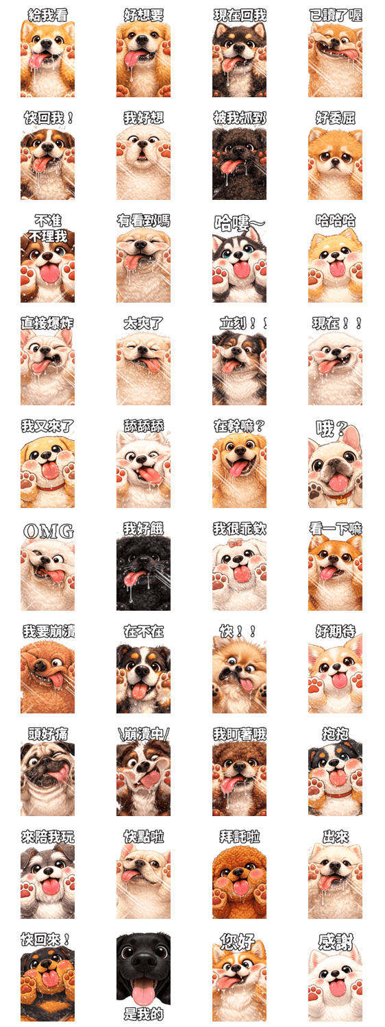 | スタンプ説明 | 40 expressive stickers featuring big-faced excited dogs with playful emotions. Perfect for reactions, daily greetings, and fun chats with friends and family. These stickers will show up extra large in chats. |