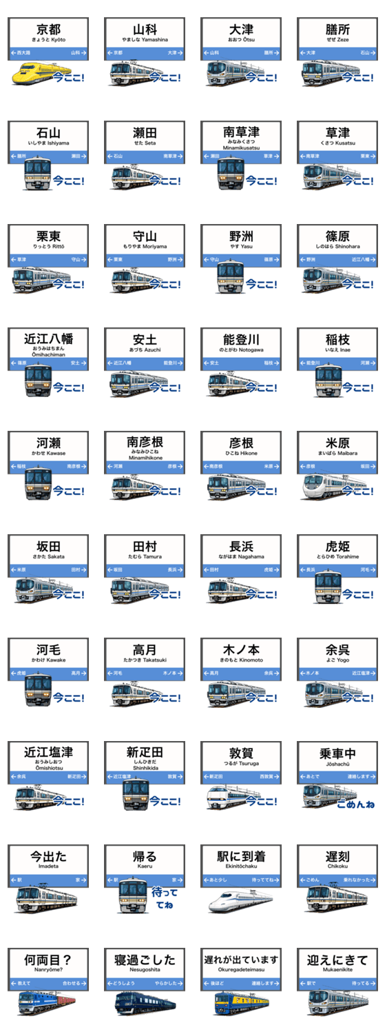 | スタンプ説明 | 琵琶湖線の駅名標風デザインの電車スタンプ。 京都・大津・草津など駅名看板風の表示で 「今ここ」「迎えにきて」など位置連絡に使えるフレーズを収録。 敦賀までの拡張版 |